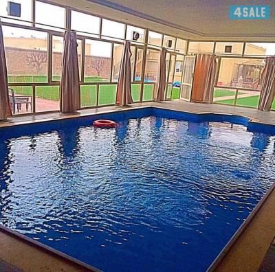 حمام سباحة مغطي اربع غرف صالة دوانية جلسة عريش مزروع ثيل بالكامل الموقع ع الشارع